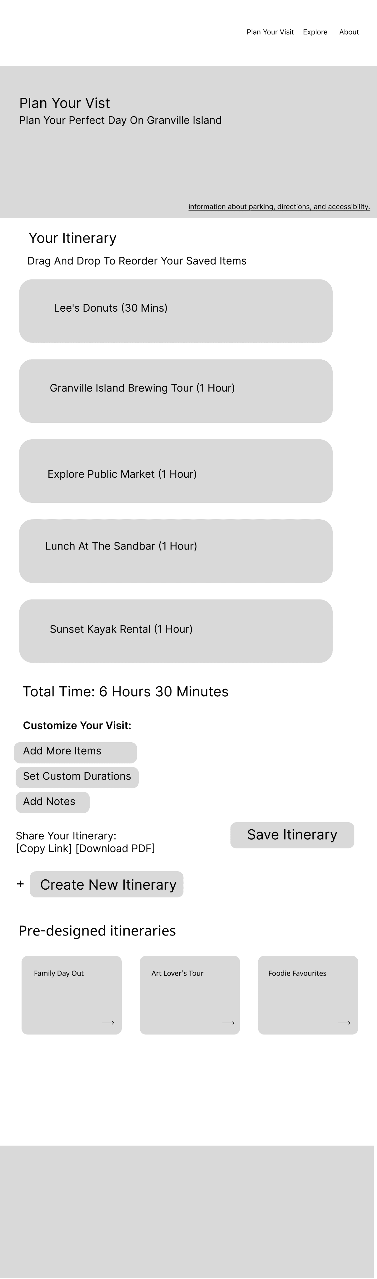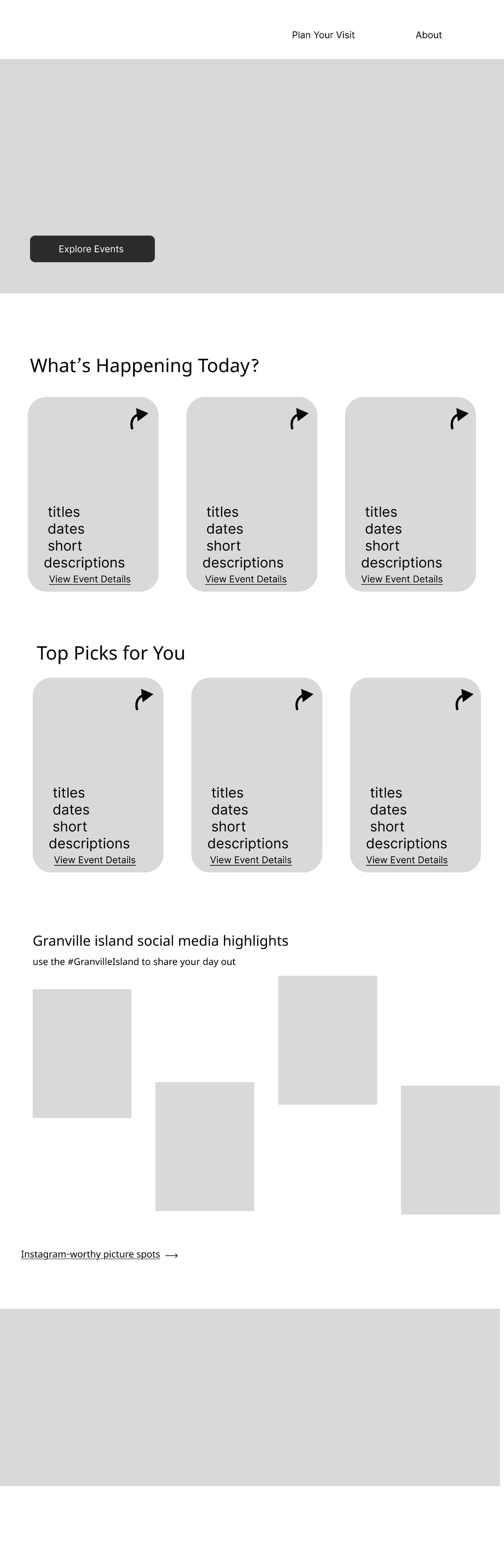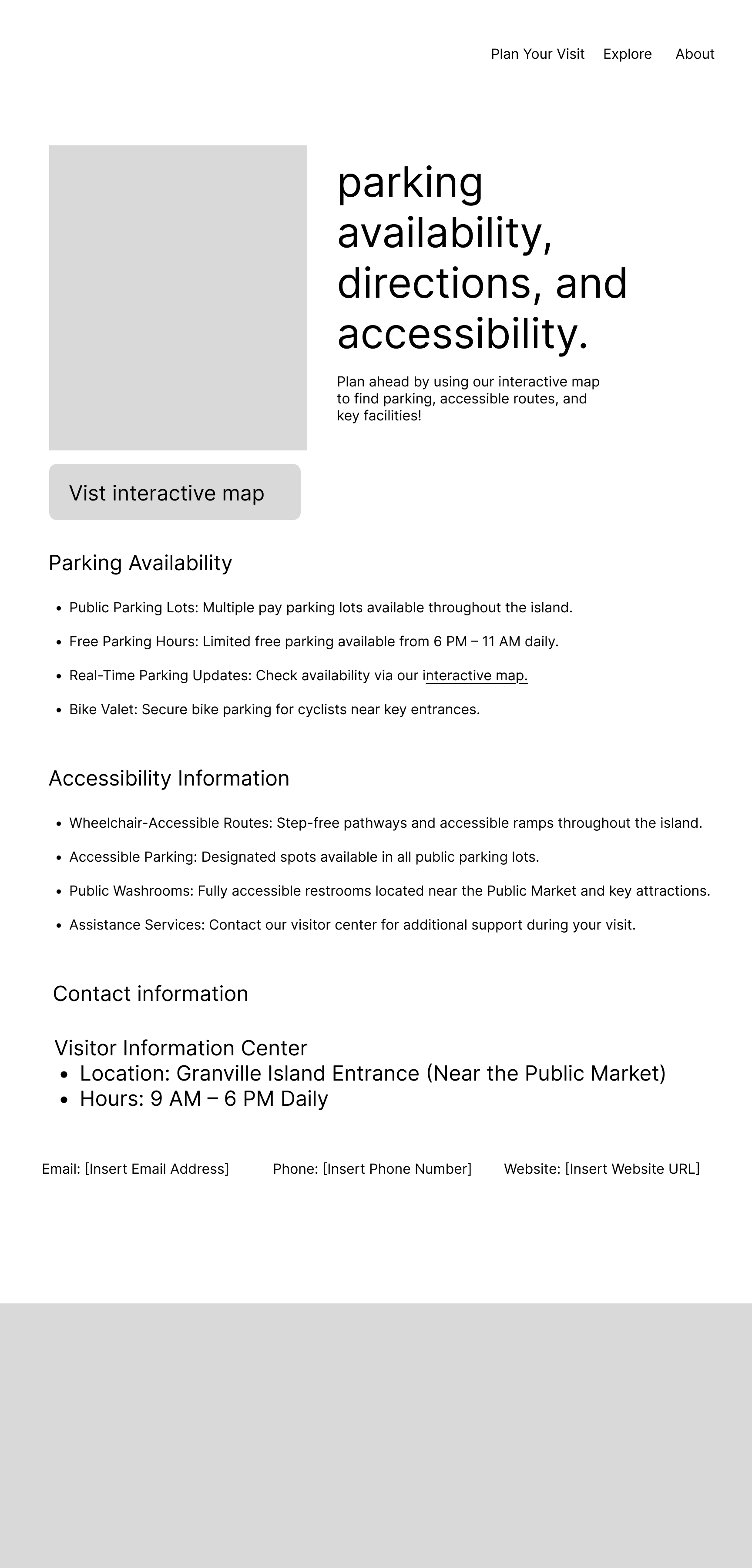 Methods: Structured interviews with 5 users who've visited Granville Island, task-based testing of wireframes, feedback analysis